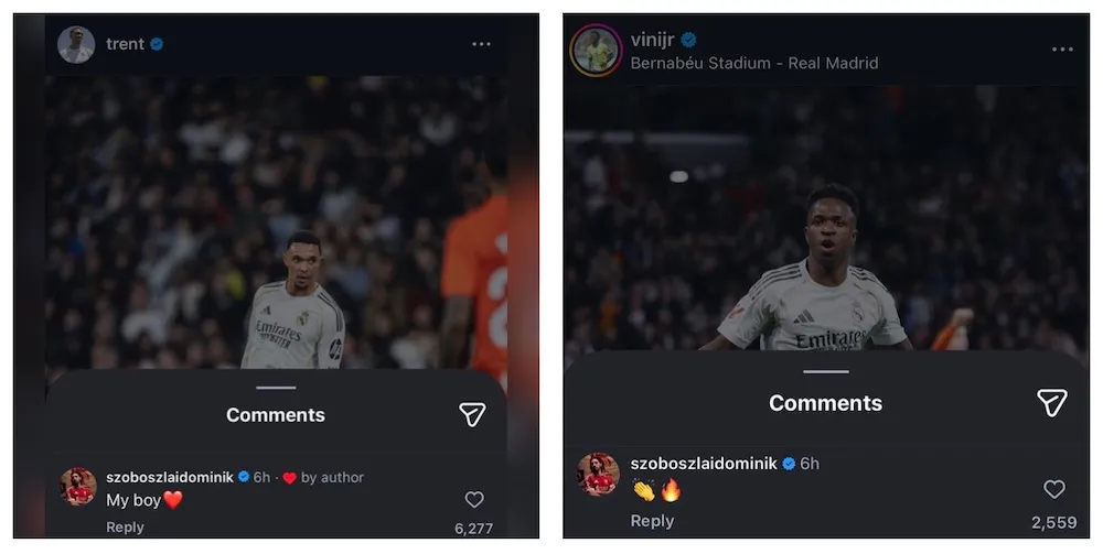 Dans la foulée, l’activité du Hongrois sur les réseaux sociaux a ravivé les spéculations. Szoboszlai a réagi aux publications de Vinícius Júnior et de Trent Alexander-Arnold après la large victoire (4-1) du Real face à la Real Sociedad.