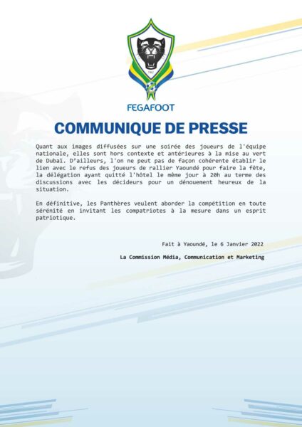 « Quant aux images diffusées sur une soirée des joueurs de l’équipe nationale, elles sont hors contexte et antérieures à la mise au vert de Dubaï », a affirmé l’instance dans un communiqué, avant de balayer une autre rumeur : « D’ailleurs, l’on ne peut pas de façon cohérente établir le lien avec le refus des joueurs de rallier Yaoundé pour faire la fête, la délégation ayant quitté l’hôtel le même jour à 20h au terme des discussions avec les décideurs pour un dénouement heureux de la situation.»