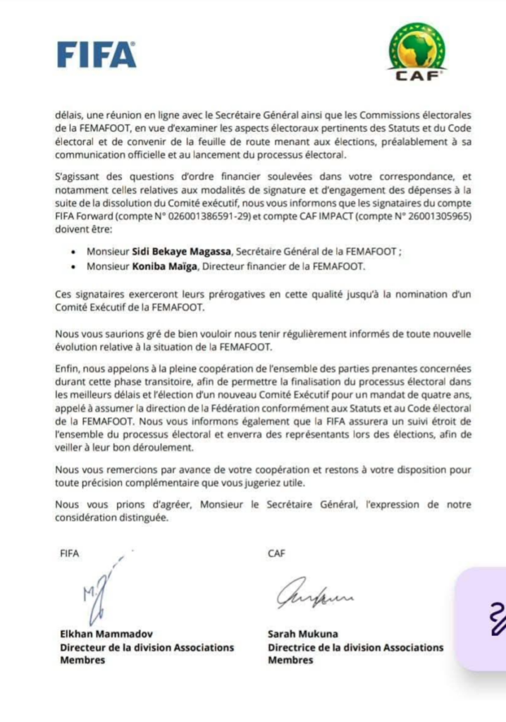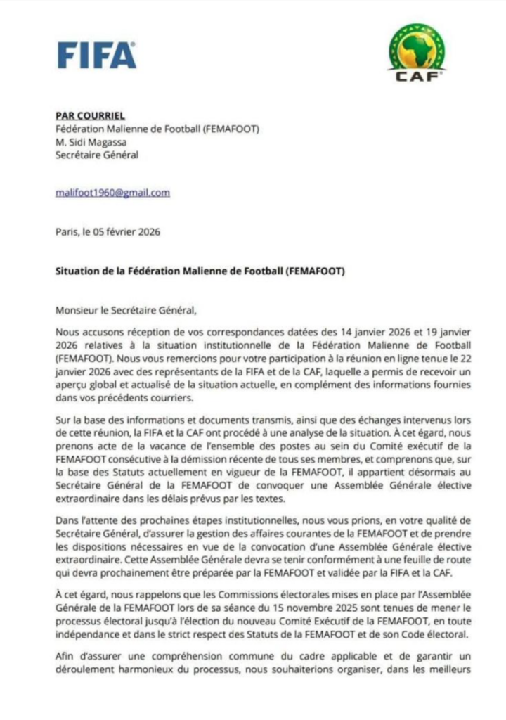 La Fédération Malienne de Football (FEMAFOOT) traverse une nouvelle phase décisive de son histoire institutionnelle. Dans une correspondance conjointe adressée au Secrétaire général de la FEMAFOOT, la FIFA et la CAF ont officiellement pris acte de la démission collective de l’ensemble des membres du Comité exécutif, entraînant de facto la vacance de tous les postes dirigeants de l’instance faîtière du football malien.