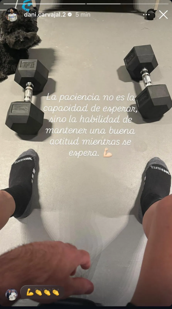 « الصبر ليس القدرة على الانتظار، بل القدرة على الحفاظ على موقف جيد أثناء الانتظار. » هذا هو الرسالة التي شاركها داني كارفاخال على إنستغرام، مرفقة بصورة له أثناء جلسة في صالة الألعاب الرياضية. رسالة تعبر عن حالته الذهنية، حيث لا يزال ينتظر فرصته بينما يؤكد أنه تعافى تماماً من الناحية البدنية.