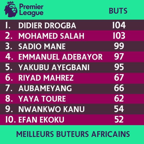 Le Togolais Emmanuel Adebayor occupe désormais 4è au classement avec 97 buts. Le Nigerian Yakubu Ayegbani revient à la 5è place avec 95 buts juste devant Riyad Mahrez, 6è avec 67 buts. L’Algérien compte un but de plus que le Gabonais Pierre-Emerick Aubameyang. Le buteur des Gunners a inscrit à ce jour, 66 buts en Premier League. Yaya Touré descend à la 8è place avec ses 62 buts et Nwankwo Kanu 9è, auteur de 54 buts en Premier League. Efan Ekoku ferme le Top 10 avec 52 réalisations.