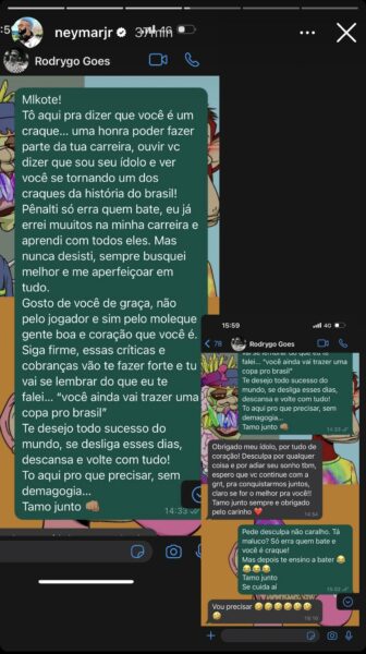 « Ne t’excuse pas, tu es fou ? Les seuls qui ratent sont ceux qui frappent. Mais par contre, je t’apprendrai à tirer. », a échangé Neymar à Rodrygo dans un message WhatsApp.