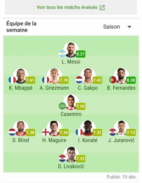 SofaScore, qui se base sur les notes cumulées des joueurs durant toute la compétition, a publié l’équipe type de cette Coupe du monde au Qatar.