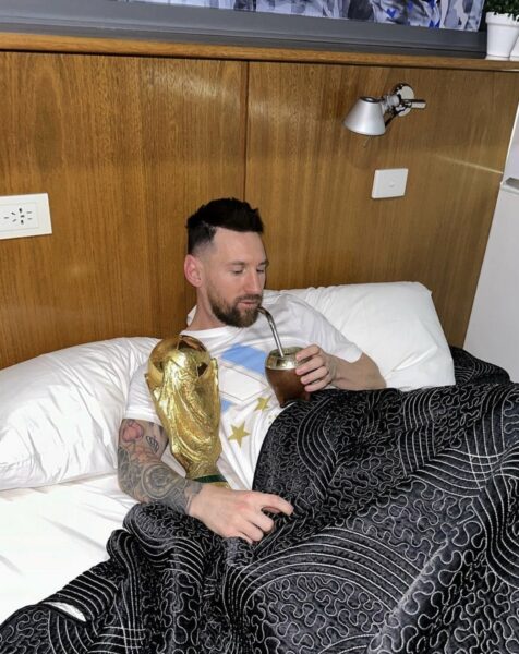 Dimanche dernier, Lionel Messi est enfin parvenu à remporter la Coupe du Monde. Une prestigieuse trophée qui vient s’ajouter à son riche palmarès. Ce mardi, le septuple Ballon d’Or a ainsi posté une série de photos sur Instagram en se mettant en scène comme s’il avait dormi avec le trophée mondial. En toute décontraction, le septuple Ballon d’Or a ensuite pris la pose au lit en tenant le Mondial dans une main et une tasse de maté dans l’autre.