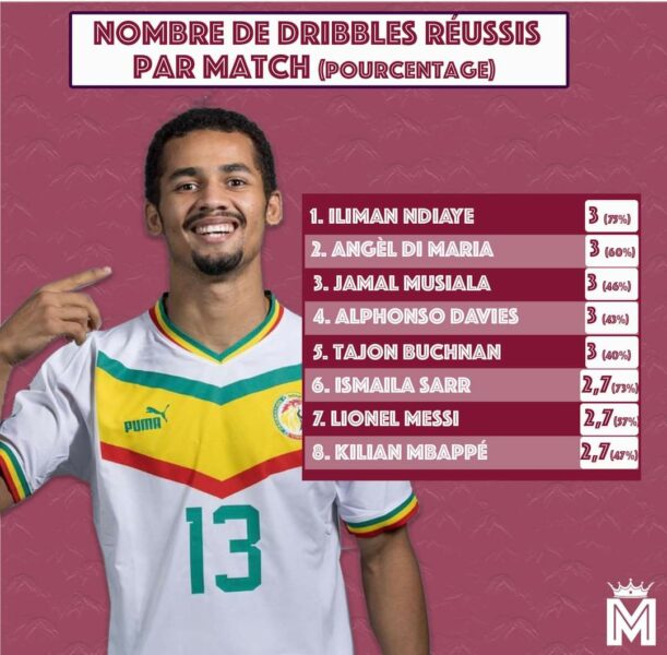 Connus pour leurs prouesses techniques, Lionel Messi (Argentine) et Kylian Mbappé (Equipe de France) sont respectivement 7e et 8e de ce classement, juste derrière Ismaila Sarr (Sénégal). Contre toute attente, c’est l’attaquant des Lions de la Téranga Iliman Ndiaye qui a le plus de pourcentage de réussite dans cet exercice (75% pour 3 tentatives) depuis le début du Mondial. Le buteur de Sheffield est d’une redoutable précision dans cet aspect offensif, lui qui n’a connu qu’une seule titularisation avec les Lions.