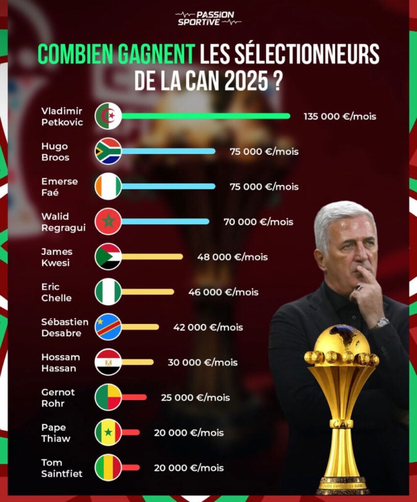 Currently, the coach earns around 20,000 euros monthly. With this increase, he would rank among the highest-paid coaches at AFCON 2025, surpassing Gernot Rohr (Benin), Hossam Hassan (Egypt), and Sébastien Desabre (DR Congo), reaching the same level as Éric Chelle, his counterpart in charge of Nigeria.