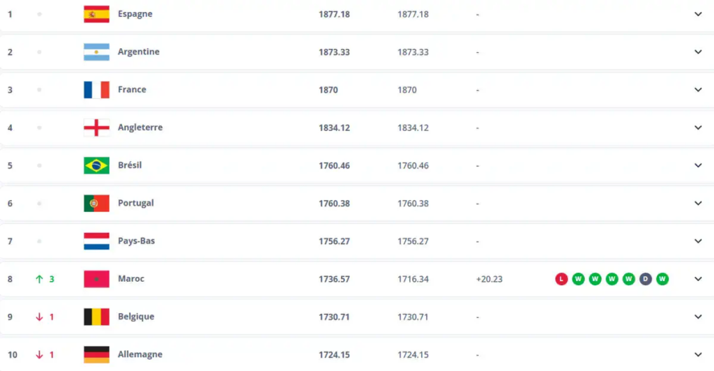 Marruecos también vive un avance histórico, alcanzando el 8º puesto mundial. Los Leones del Atlas superan así a Bélgica (9º) y Alemania (10º), firmando el mejor ranking de su historia.