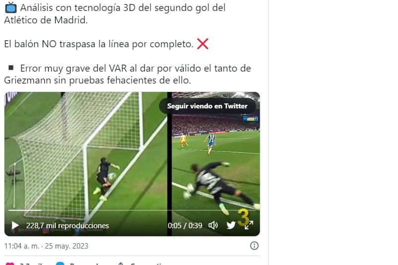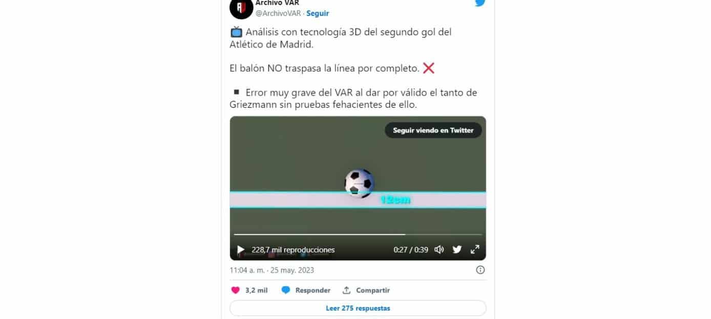 Le but de Griezmann lors du match Espanyol-Atlético, marqué lors du nul 3-3 ce mercredi, n’était pas valable. Initialement, l’arbitre a refusé le but, mais suite à l’intervention de la VAR, il a changé sa décision, ce qui était une erreur très grave. La modification de la décision a été effectuée sans preuve fiable que le ballon avait franchi la ligne de but. L’architecte Nacho Tellado a démontré, ce jeudi, avec une vidéo partagée sur le compte Twitter @ArchivoVAR, que le but n’était en réalité pas valable.