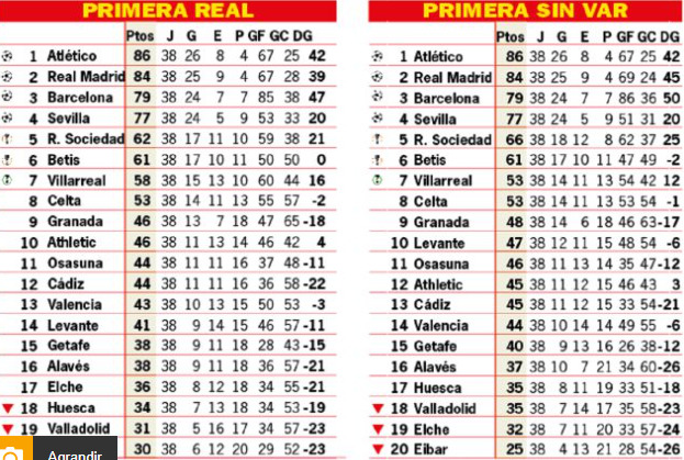 Ainsi, à quoi aurait ressemblé le classement du championnat espagnol sans la VAR ? Sans le moindre changement pour les quatre équipes de tête. L’Atlético Madrid, le Real, le FC Barcelone et le FC Séville seraient aux mêmes places avec le même total de points.