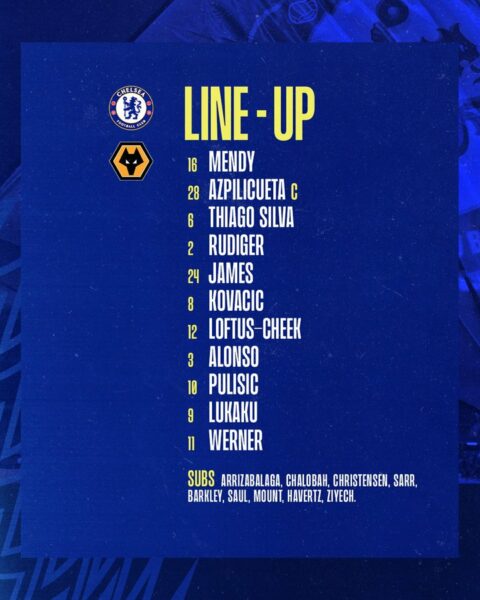 Chelsea : Mendy, Azpilicueta, Thiago Silva, Rudiger, James, Kovacic, Loftus-Cheek, Alonso, Pulisic, Lukaku, Werner