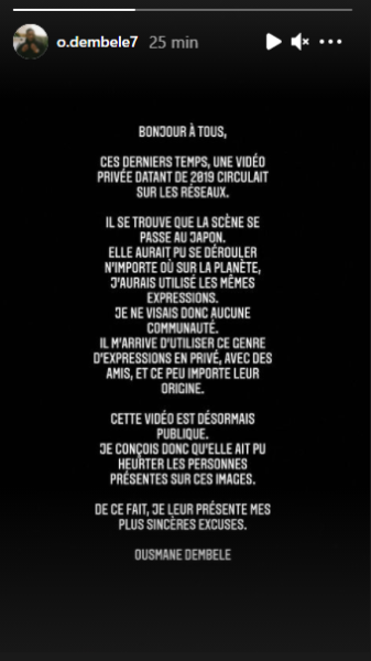 « Bonjour à tous, ces derniers temps, une vidéo privée datant de 2019 circulait sur les réseaux. Il se trouve que la scène se passe au Japon. Elle aurait pu se dérouler n’importe où sur la planète, j’aurais utilisé les mêmes expressions. Je ne visais donc aucune communauté. Il m’arrive d’utiliser ce genre d’expressions en privé, avec des amis, et ce, peu importe leur origine. Cette vidéo est désormais publique. Je conçois donc qu’elle ait pu heurter les personnes présentes sur ces images. De ce fait, je leur présente mes plus sincères excuses. Ousmane Dembélé. », a-t-il écrit en story Instagram.