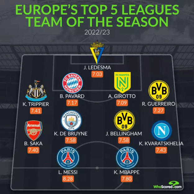 Bukaya Saka (Arsenal) et Kevin De Bruyne (Manchester City) sont au milieu de terrain, aux côtés de Jude Bellingham (Borussia Dortmund) et de Khvicha Kvaratskhelia (Naples).