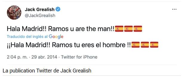 [totalpoll id= »812288″]Malgré cela, le joueur ne supporte pas le FC Barcelone en Espagne, son équipe favorite est le Real Madrid, du moins c’est comme cela qu’on pouvait le voir dans un autre tweet. Mais le 29 avril 2014, le jour où l’équipe merengue a battu le Bayern Munich 4-0 avec un doublé de Sergio Ramos et se qualifie pour la finale de l’UEFA Champions League, Jack Grealish s’est enflammé. «Allez Madrid !! Ramos tu es l’homme !!», avait publié Grealish.