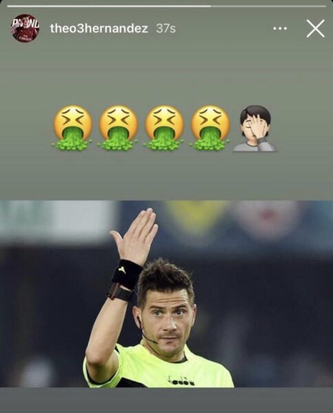 Après la défaite du Milan AC ce dimanche face au Napoli, Theo Hernandez a fait une publication surprenante sur son compte Instagram. En effet, le défenseur français, a posté une photo de l’arbitre de la rencontre, Fabrizio Pasqua accompagnée de plusieurs émojis de dégoûts. Une photo qu’il a malgré tout rapidement supprimé.