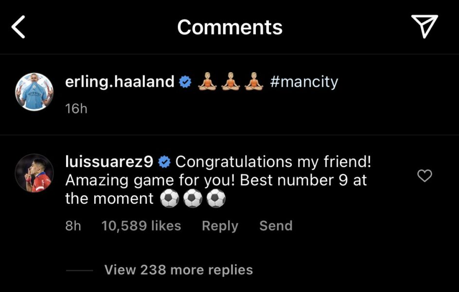 « Félicitations mon ami ! Un match incroyable pour toi ! Le meilleur n°9 du moment », a écrit l’ancien barcelonais zn comme d’une publication de Haaland sur Instagram.