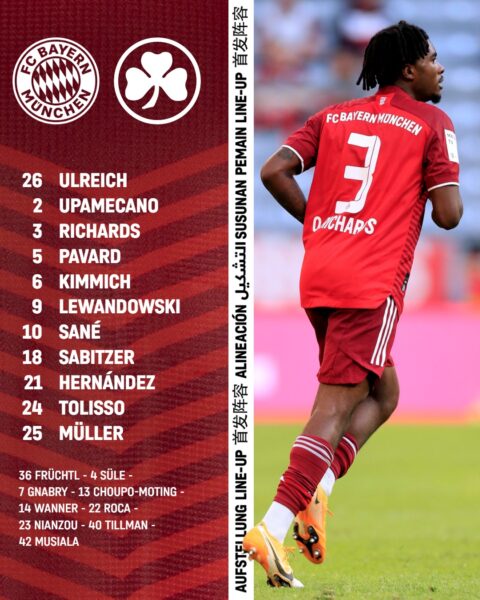 Bayern : Ulreich – Pavard, Upamecano, Hernández, Richards – Kimmich, Tolisso – Sabitzer, Müller ©, Sané – Lewandowski