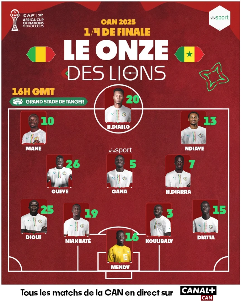 À quelques heures du coup d’envoi, prévu à 16h00 GMT au Grand Stade de Tanger, Pape Bouna Thiaw a arrêté son onze de départ pour ce choc face aux Aigles du Mali. Le technicien sénégalais a choisi d’apporter des ajustements notables, notamment dans le secteur offensif, afin d’apporter plus de percussion et de fraîcheur à son équipe.
