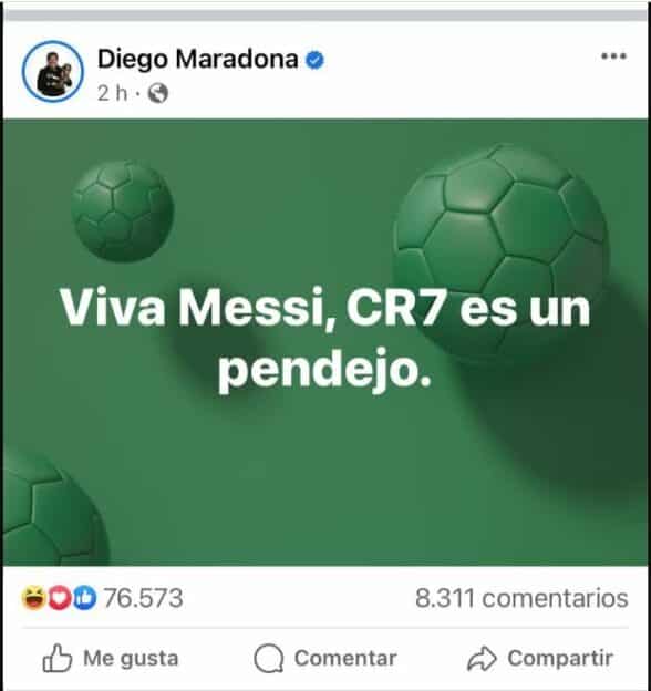 Le compte Facebook officiel de la légende du football, Diego Maradona, a récemment été victime d’une cyber-attaque. Des messages inhabituels et blessants ont été publiés et ont suscité l’indignation. Malgré les efforts déployés pour reprendre le contrôle du compte, les messages indésirables persistent. Le plus viral concerne un message injurieux sur … Cristiano Ronaldo.