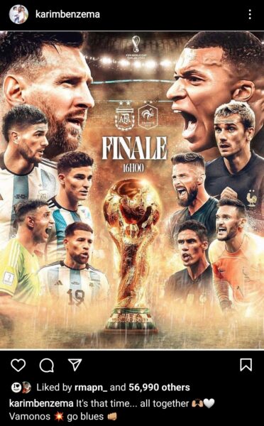 Après Zinédine Zidane, c’est désormais au tour de Karim Benzema d’apporter son soutien aux Bleus. Le Nueve a encouragé ses compatriotes à aller chercher la troisième étoile sur son compte Instagram malgré les rumeurs le concernant ces dernières heures.