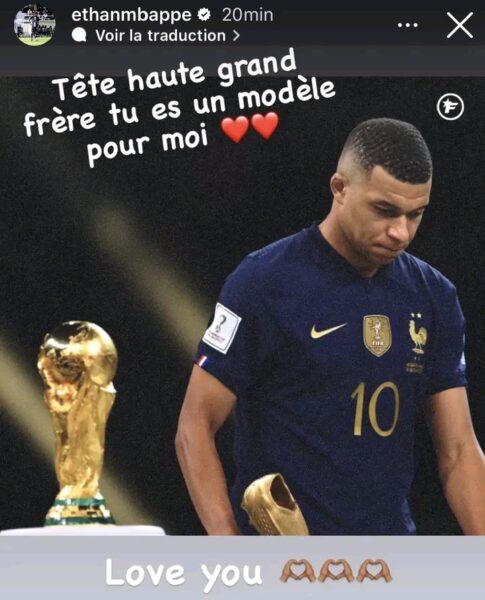 Après la défaite, Ethan Mbappé a envoyé un message à son frère sur story Instagram : « Tête haute grand frère, tu es un modèle pour moi. »