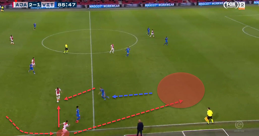 Remarquez dans l’image ci-dessus comment cela s’est souvent déroulé à l’Ajax et comment cela pourrait continuer à Barcelone. Dest reçoit le ballon dans sa moitié de terrain mais continue à courir avec le ballon jusqu’à ce qu’il puisse se connecter avec l’ailier qui tombe. Une fois que les marqueurs ont été retirés de leur position et que l’espace a été créé, un simple un-deux avec son coéquipier déploie l’Américain dans le dernier tiers sur une course qui se chevauche.