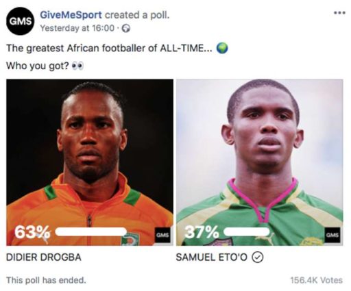 Didier Drogba et Samuel Eto’o ont été les deux gagnants du sondage Facebook. Cependant, il ne pouvait y avoir qu’un seul vainqueur et, après une énorme masse de 157 000 voix, c’était Drogba qui s’est vu élire meilleur footballeur africain de tous les temps.