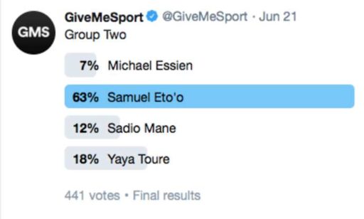 [totalpoll id= »812288″]Le second était composé de Michael Essien, Samuel Eto’o, Sadio Mane et Yaya Touré. Samuel Eto’o, ancien joueur de Barcelone et de l’Inter Milan, s’est imposé avec 63% des suffrages.