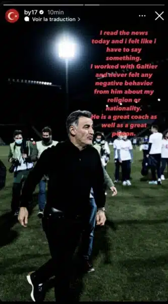 « J’ai lu les nouvelles aujourd’hui et j’ai senti que je me devais de dire quelque chose. J’ai travaillé avec Galtier et je n’ai jamais senti le moindre comportement négatif de sa part à cause de ma religion ou de ma nationalité. C’est un entraîneur fantastique autant qu’une personne fantastique. », a ainsi écrit Yilmaz sur sa story Instagram, comme en témoigne la capture ci-dessous.