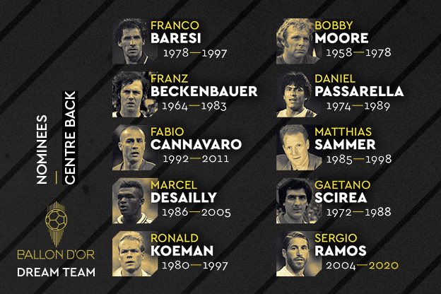 On retrouve entre autres des légendes à l’image de Franco Baresi, Beckenbaeur, Ronald Koeman, Cannavaro ou encore Sergio Ramos. À noter tout de même les absences de Paulo Maldini, quintuple vainqueur de la Ligue des champions et Carles Puyol, ancienne gloire du FC Barcelone.