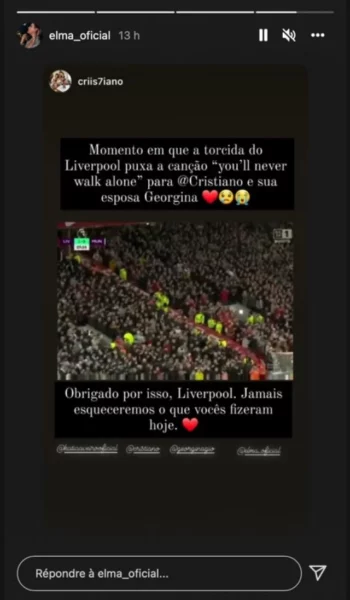 Pour apporter leur soutien à CR7, les fans Reds se sont levés à l’unisson à la 7ème minute pour observer une minute d’applaudissement. Et Elma Aveiro, la soeur de Cristiano Ronaldo, a souhaité remercier Anfield pour ce geste de soutien qui restera assurément gravé dans les esprits : «merci pour ça Liverpool. Nous n’oublierons jamais ce que vous avez fait pour nous aujourd’hui.»