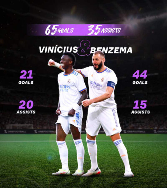 Et c’est sans surprise que le duo monstrueux Benzema-Vinicius s’empare du lauréat. Les deux merengues sont impliqués dans 100 buts sur les réalisations de la Casa Blanca cette saison. Robert Lewandowski et Thomas Muller du Bayern arrive deuxième à sept buts de retard. Le duo parisien Lionel Messi-Kylian Mbappé ferme le podium, tan disque les stars africaines de Liverpool Salah-Mané pointent à la quatrième place avec 73 artifices.