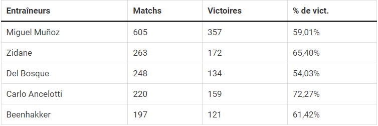 Outre ses titres, Ancelotti est également le quatrième entraîneur avec le plus de matchs dirigés (220) derrière Miguel Muñoz (605), Zidane (263) et Del Bosque (248). Parmi tous ceux qui ont dirigé au moins 50 matchs officiels pour le Real Madrid, l’ancien coach du PSG a également le meilleur pourcentage de victoires : 72,3%.