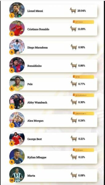 Après ce travail minutieux, c’est Lionel Messi qui arrive en tête avec 20,94%. La Pulga est donc désignée GOAT devant Cristiano Ronaldo, deuxième avec 11,09%. Maradona est 3è suivi de Ronaldinho 4è, Pelé 5è. Kylian Mbappé est 9è de ce classement.