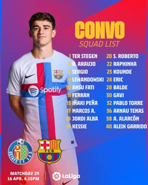 Comme lors des précédents matchs, le manager catalan a choisi d’inclure Pablo Torre dans l’équipe, bien que celui-ci n’ait pas eu suffisamment de temps de jeu au Barça. Il est possible que Torre quitte le club en prêt cet été. Dans la sélection, on trouve également Angel Alorcon, qui a eu quatre apparitions en championnat et en coupe cette saison, ainsi que Aleix Garrido, qui n’a joué qu’une courte période en Liga.