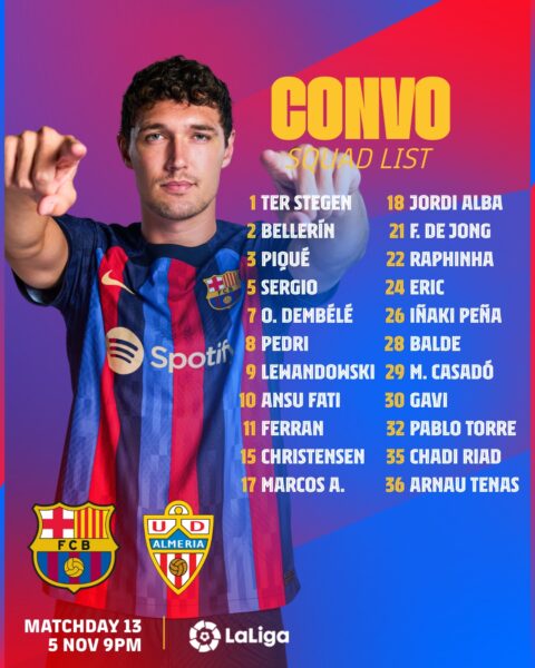L’équipe Xavi Hernandez aura l’opportunité de prendre provisoirement les commandes du Championnat espagnol, avant le déplacement du Real Madrid sur le terrain du Rayo Vallecano. Pour y parvenir, le technicien catalan pourra notamment compter sur les retours sur blessures d’Andreas Christensen et d’Eric Garcia. Jules Koundé ne sera pas en revanche disponible pour cette rencontre en raison de blessure.