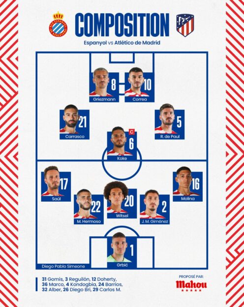 Alvaro Morata absent, c’est Angel Correa et Antoine Griezmann qui seront sur le front de l’attaquant de l’Atlético. Au milieu de terrain, le trio Saul Niguez, Koke et le champion du monde Rodrigo de Paul. Une défense à cinq avec Yannick Carrasco et Nahuel Molina comme pistons. Mario Hermoso, Jose Maria Jiménez et Axel Witsel forment le tril central.