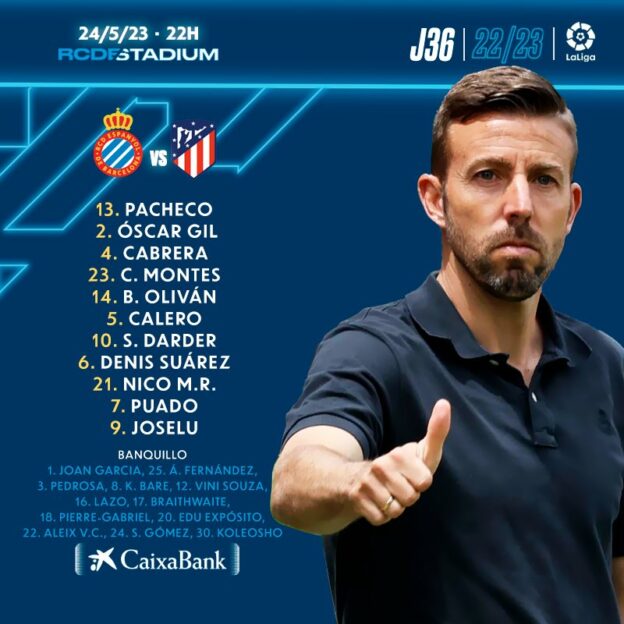 Côté Espanyol, Luis Garcia Fernandez a composé une équipe compétitive avec Javi Puado et Joselu sur le front de l’attaque. Sergi Darder, Denis Suarez, Leandro Cabrera ou encore Fernando Pacheco sont également présents pour débuter la rencontre.