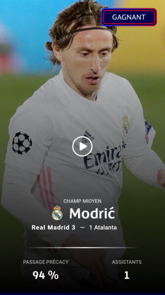 En effet, le milieu de terrain merengue a été élu joueur de la semaine par l’UEFA. Le numéro 10 de la Casa Blanca (94% passes réussies) concourrait ce prix avec Kevin De Bruyne (82%), Ngolo Kanté (87%) et Joshua Kimmich (86%). Une distinction qui ravira les supporters madrilènes.