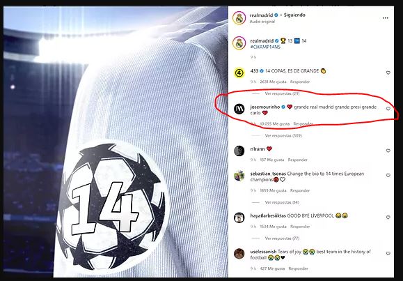 Hier soir, après la victoire du Real contre Liverpool, l’ancien entraineur Meringue a envoyé un message de félicitations au club pour son triomphe. Le Special One a répondu sur l’un des posts Instagram du Real Madrid : « Grand Real Madrid, grand Président, grand Carlo ».